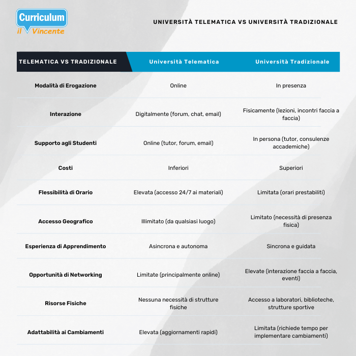 Le principali differenze riguardano la modalità di erogazione (online vs. in presenza), l’interazione (digitale vs. fisica), il supporto agli studenti (online vs. in persona) e i costi (inferiori per le telematiche).