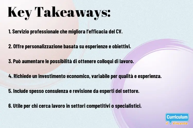 A: I principali vantaggi includono la possibilità di avere un curriculum scritto da esperti del settore, che sanno come valorizzare le esperienze e le competenze, adattare il CV a specifiche offerte di lavoro e migliorare le probabilità di essere selezionati per un colloquio.